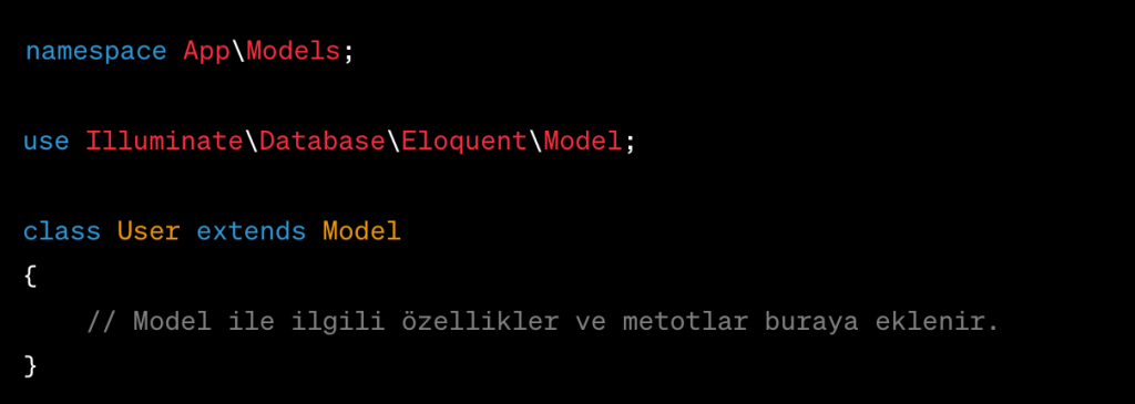 Laravel’de model, genellikle app/Models dizininde bulunan ve veritabanı ile etkileşimde bulunan sınıflardır. Bir model, veritabanındaki tabloya karşılık gelir ve Eloquent ORM (Object-Relational Mapping) kullanılarak bu tablo ile etkileşim sağlanır.